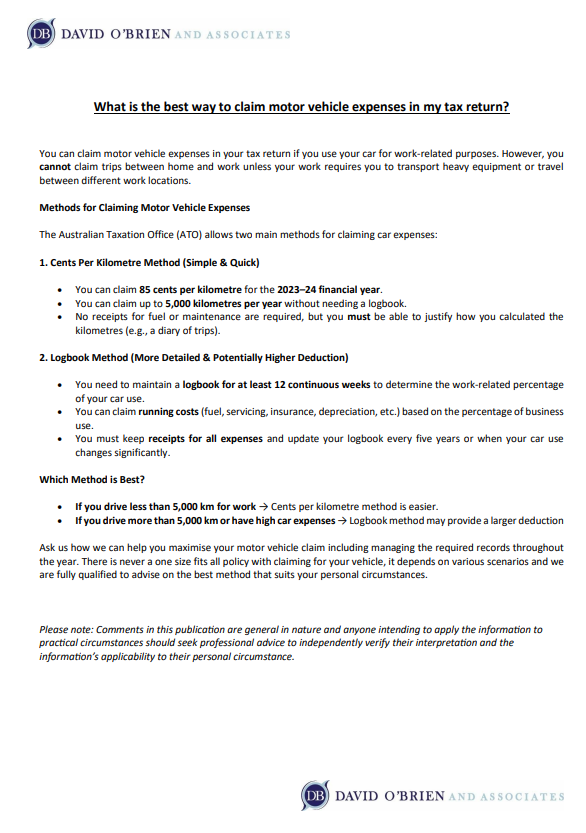 What is the best way to claim motor vehicle expenses in my tax return?David O'Brien and AssociatesJun 20, 20240 min readUpdated: Apr 1, 2025